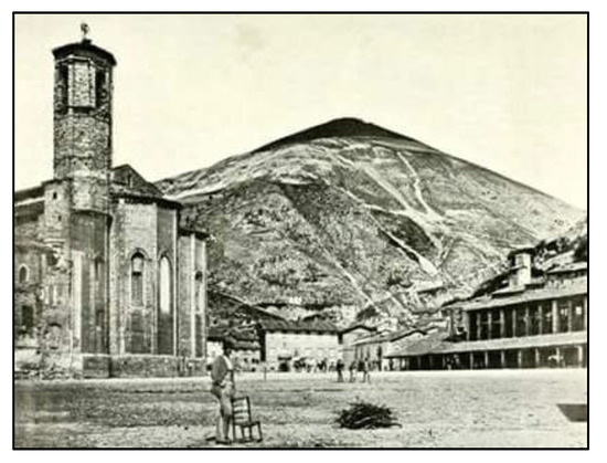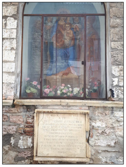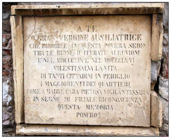 As evidence that such flood events were frequent in the Gubbio Plain, the text of the epigraph is reported, affixed after two important alluvial events in Camignano River occurred. One occurred in the aedicule (already mentioned, located on the right bank of the Camignano River and the other in the district of San Martino, which is located within the historic center of Gubbio) (Figure 21). The citizens of Gubbio thank the effigy of the Madonna with the words, translated from the Italian: “To you, Great Virgin Help of Christians who, motionless in this poor location among the ruins of repeated floods in 1859 and 1866, wanted to save the lives of so many citizens in danger, the elite of the districts, as to a dear, most vigilant, compassionate mother, as a sign of filial gratitude, this memory they put.”