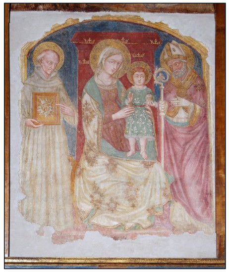 Currently, on the main altar of the church of the Madonna del Ponte, near the bridge over the San Donato Creek, there is a detached block fresco coming from the chapel described above. It is assumed that the aedicule, contained in it, was placed near the bank of the San Donato Creek to invoke protection from any damage that the stream could cause with its floods, as was the custom in that period and in the following centuries [45]. See, for example, the still present aedicule, located on the right bank of the Camignano River, near the bridge that crosses it in the San Martino district, within the historic center of Gubbio (Figure 9). The fresco in question (Figure 10) depicts the Madonna and Child enthroned between St. Bernardino and a holy bishop (perhaps St. Ubaldo or St. Donato) and is attributed to the Gubbio painter Jacopo Bedi who realized it shortly after the mid-15th century.