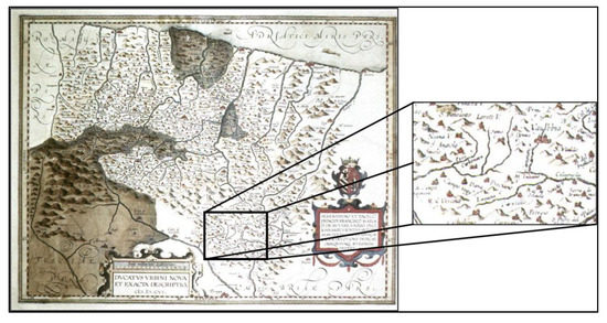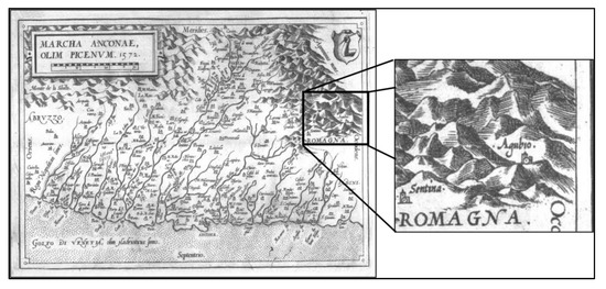 We found the examined cartography, which was produced before Georgi’s Map (1570), to be unhelpful, as it is not detailed enough to confirm that how the San Donato Creek flowed into the Saonda River (Chiascio River basin). These maps are drawn on too small a scale, which does not allow for a degree of detail that can correctly identify the hydrograph network of the Gubbio Plain (Figure 11).