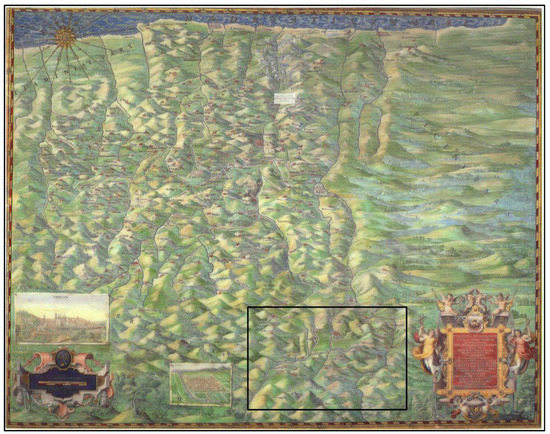 Some maps produced after Georgi’s present the same problem because the Gubbio area is located on the edges of the cartographic representation and is therefore not well sketched (Figure 12). Others, which are in any case the majority, all show the San Donato Creek with a track like the current one, i.e., flowing into the Assino River (Figure 13). Among the latter, the closest in time to Georgi’s Map is “Urbini Ducatus” by Egnatio Danti, produced between 1580 and 1582 and preserved as a mural painting in Rome, in the Vatican Museums (Figure 14 and Figure 15).