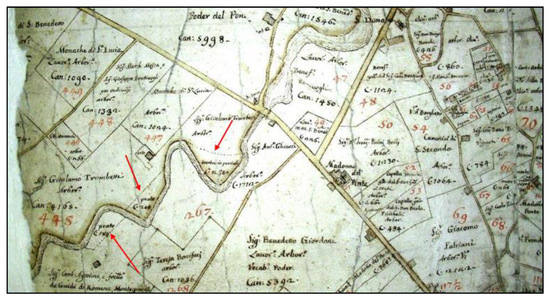 The first of the two hypotheses mentioned above seems scarcely credible. In fact, no archival document has been found in the “Riformanze” contained in the Historical Archive of Gubbio (dating from 1326 to 1815, which faithfully report any works of public utility carried out in the area) that testify to the implementation of hydraulic works in that period. This was a period in which Gubbio, under the regency of the Della Rovere, was in a non-florid state of the municipality and its economy [47,48]. Furthermore, the reasons that would have led to carrying out works of this kind are absent (i.e., modifying a riverbed and making it flow towards another hydrographic basin). The drainage and rectification works of the riverbed of the San Donato Creek, as seen today, must have taken place no earlier than the 19th century. Graphic indications relating to a possible rectification project of some reaches, for hydraulic protection purposes, are already present in the Ghelli’s Cadastre (1768; Figure 16). The San Donato Creek still has a sinuous pattern; plans of adjustment of the San Donato Creek riverbed are present in the Gregorian Cadastre, affixed after the creation of the map, probably after 1880, when its maps were “redrawn” [49] (Figure 17).