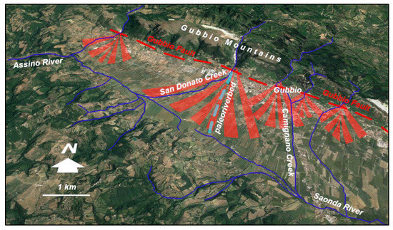 The extensional phase was superimposed from the previous one, cutting the aforesaid anticline precisely in correspondence with its nucleus via an important normal fault [35]. It produced a large tectonic trench, i.e., the Gubbio Plain, which spans about 24 km in a NW-SE direction. The subsidence of this basin, with endorheic characteristics, initially allowed the formation of a lake, in the Plio-Pleistocene age, subsequently drained and filled by sediments in lacustrine and fluvial-lacustrine facies transported by streams flowing from both sides (north-eastern and south-western) of the basin itself [36,37]. The establishment of the graben generated a local base level of erosion for all these rivers which, from the area in subsidence, began their process of regressive erosion [38]. The result, from the geomorphological point of view, is the alignment of a series of reliefs (Gubbio Mountains), structurally constituted by what remains of the anticline fold and divided from each other by narrow valleys, produced from the streams that flow into the Gubbio Plain forming large alluvial fans (Figure 3) [39].