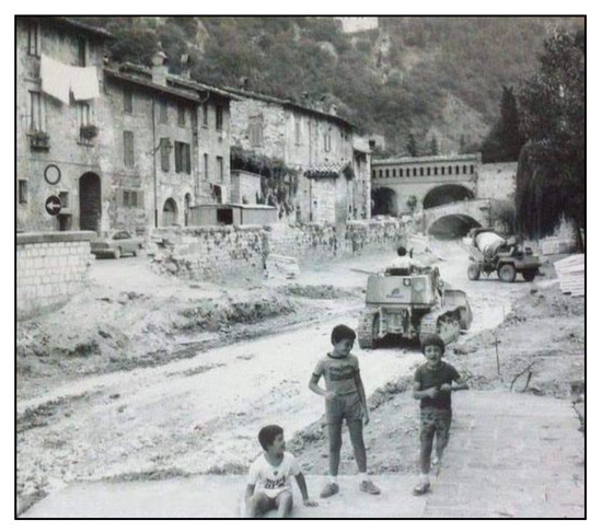 From the data and results described, different conditions and morphogenetic factors emerge between the period under consideration (16th century) and the current situation. Different from past periods, the streams flowing from the Gubbio Mountains towards the Gubbio basin present a regime strongly controlled by the riverbed and slope arrangements. This, presumably, only began in the last century, up to the paving of the Camignano River, which took place near the end of the 1970s (Figure 22).