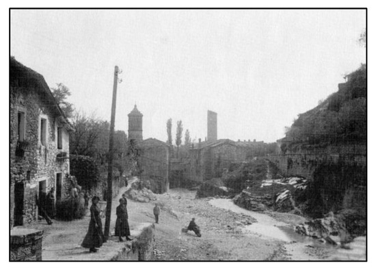 Proof of this is the photographic evidence that, already from the 1800s and up to the 1950s, showed slopes bare of vegetation and affected by debris flows (Figure 23 and Figure 24), such as that of 1341, described by Luongo [38]. The detrital material easily poured into the streams, which presented a greater solid transport than the current one (Figure 25). Moreover, in the absence of regulation of rainwater and runoff on the slopes, the rivers were subject to sudden floods, causing frequent and severe damage to the structures and the resident population. Historical testimonies document these conditions of hydrogeological risk (Table 2).