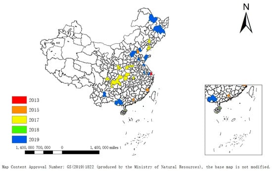 The core explanatory variable of this study is PFTZ. Since 2013, the Chinese government has initiated a total of 21 PFTZs. Specifically, there were 1, 3, 7, 1, 6, and 3 PFTZs established in 2013, 2015, 2017, 2018, 2019, and 2020, respectively. Each PFTZ contains several zones distributed in different cities (see Figure 1), with 1, 6, 15, 4, 19, and 7 cities distributed with a PFTZ in 2013, 2015, 2017, 2018, 2019, and 2020, respectively. Due to the data limitation, our research period is limited to 2019; we only explore the policy effect of the first five batches of PFTZs (i.e., from 2013 to 2019). The variable is set as follows: if the PFTZ is established in city i at year t, then variable PFTZ equals to 1 since year t, and 0 otherwise.