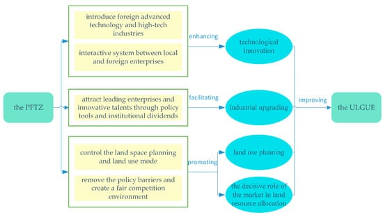 Third, the PFTZ can effectively improve ULGUE through land use planning and the decisive role of the market in land resource allocation [44,47]. To be specific, in order to guide industrial upgrading, the local government will control the land space planning and land use mode of the PFTZ, which will directly affect the ULGUE. As demonstrated in the Introduction section, in order to build and adapt to the new industrial pattern, the PFTZ has been exploring the economical and intensive use mode of urban land, which is mainly reflected in the high elasticity of land use and the joint development of incremental and stock land. For example, the Anhui PFTZ proposed to implement an industrial land supply chain and realize overall supply of multiple land parcels involved in key links and core projects of the industrial chain. The Hainan PFTZ implemented a differentiated land supply model for industrial projects, which improves the level of intensive land use. On the other hand, by removing policy barriers and creating a fair competition environment, the PFTZ establishment gives full play to the decisive role of the market in the allocation of land resources. With the improvement of marketization, the land allocation efficiency can be continuously improved; thus, ULGUE can be promoted. Figure 2 depicts the theoretical framework of this study.