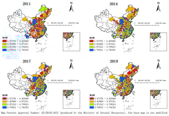 Figure 3 shows the spatial distribution of ULGUE in 2011, 2014, 2017, and 2019. In terms of trends over time, ULGUE is fluctuating upward, with its average value rising from 0.607 to 0.648 during 2011–2019. From the spatial viewpoint, ULGUE of cities like Beijing and Shanghai is always in the forefront, which may be due to their relatively developed economies and high resource allocation efficiency. At the same time, we also find that ULGUE shows obvious spatial agglomeration. Areas with high ULGUE are mainly distributed in the southeast coastal and northwest China, while low ULGUE areas are mainly distributed in north China, northeast China and southwest China.