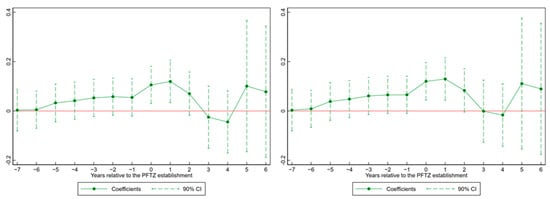 | 3 | β1, β2, …, and β7 are the coefficients of 7 years, 6 years, …, and 1 year before the PFTZ establishment, β8 is the coefficient of the PFTZ establishment. β9, β10, …, and β14 are the coefficients of 1 year, 2 years, …, and 6 years after the PFTZ establishment. |