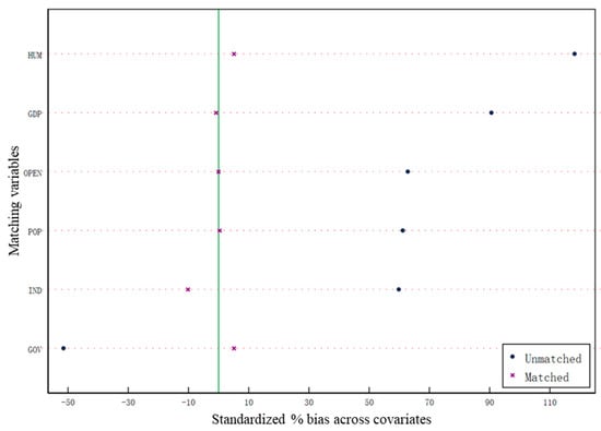 PFTZ establishment is a national strategy in China; there may therefore exist the problem of sample-selection bias. This study applied the PSM method to match the sample with the least-neighbor matching method. Figure 5 presents the balancing test results. We can find that the absolute values of the standardized bias of all matching variables between the experimental and control cities do not exceed 10% after matching. This indicates that the sample distribution of the experimental group and the control group has good consistency, and the matching effect is good. Based on the matched sample, we further conducted the basic regression; the result is shown in Table 4. The coefficient of PFTZ remains significantly positive at the 1% level, further supporting the basic regression results.