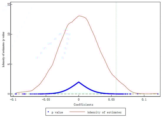 We further conducted a placebo test to alleviate the interference of the unobservable factors [52]. First, we randomly selected 1, 6, 15, 4, and 19 cities in 2013, 2015, 2017, 2018, and 2019, respectively, as the cities in which the PFTZs were distributed. Second, we constructed a virtual variable to represent the virtual variable PFTZ and conducted the basic regression again. The processes above were repeated 1000 times, and we could obtain 1000 “spurious” estimated coefficients of variable PFTZ. Figure 6 depicts the coefficient nuclear density and the corresponding p-value distribution. The mean values of the coefficients are close to 0 with the p-value mostly greater than 0.1, meaning that the basic result is not disturbed by unobservable factors.