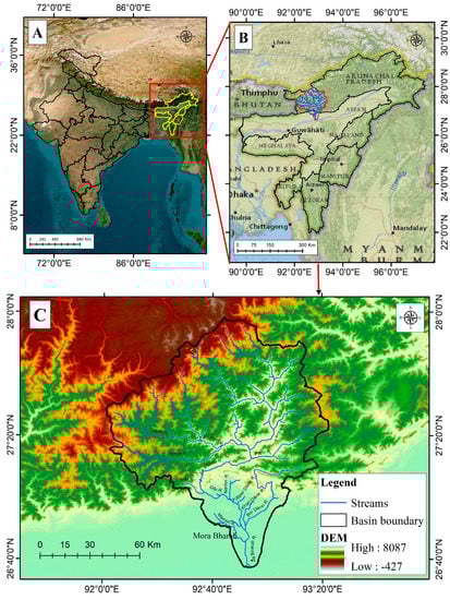 Location map of the study area. (A) India map showing northeast India; (B) northeast India showing the Jia Bharali River basin; (C) Jia Bharali River basin showing the main stream and its tributaries.