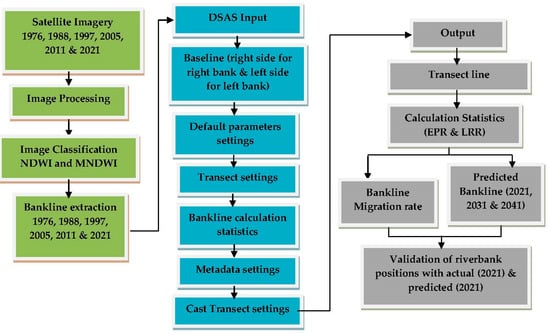 Usually, the Shoreline Change Envelope (SCE) technique is used to confirm forecasted lines [39]. SCE was used in this analysis as a Bankline Change Envelope [BCE] to validate the projected bankline. Thus, banklines between 1976 and 2011 were processed using the DSAS to predict the bankline in 2021.The forecasted shoreline (2021) and actual shoreline (2021) retrieved from a Sentinel-2B satellite image (acquired in November-December 2021) were compared in a DSAS environment to measure differences between the actual and forecasted shorelines. The adopted methodology is shown in a flowchart (Figure 2).