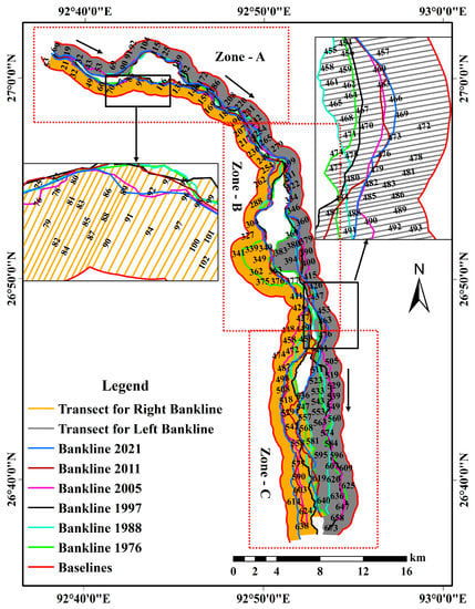 Banklines of selected study years are positioned along the baseline and transect lines were drawn separately for both the right and left bank. All transects are oriented at angle with the corresponding baselines.