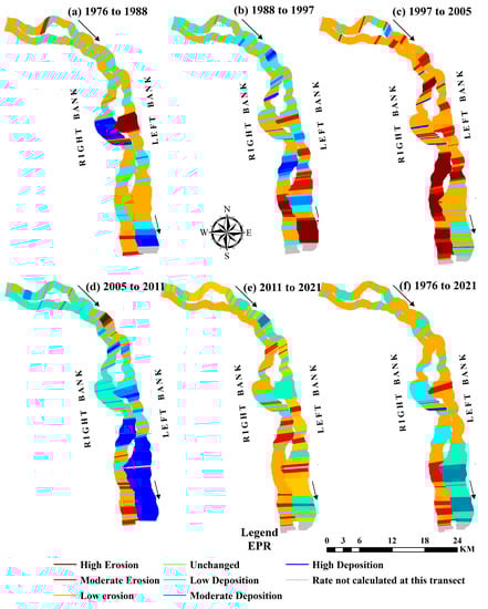 EPR-based channel migration rate (erosion and deposition) during the periods of (a) 1976 to 1988, (b) 1988 to 1997, (c) 1997 to 2005, (d) 2005 to 2011, (e) 2011 to 2021, and (f) 1976–2021.