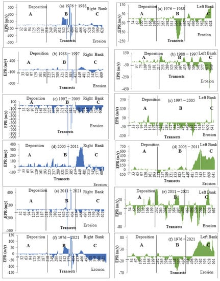 The LRR-based migration/erosion and deposition rates during 1976 to 2021 (Figure 5) resemble EPR trends (Figure 6). On both banks, the average erosion rate was −20.96 and −10.61 m/y and deposition was 22.20 and 31.23 m/y, respectively. Right bank shifting averaged −10.78 m/y, whereas left bank shifting averaged 6.7 m/y over this period (Table 5). The average shift rate was negative and positive (deposition) on the right and left banks, respectively. The dynamicity was higher in zones C and B relative to zone A. Channel expansion, rather than narrowing, predominated throughout the 46 year study period.