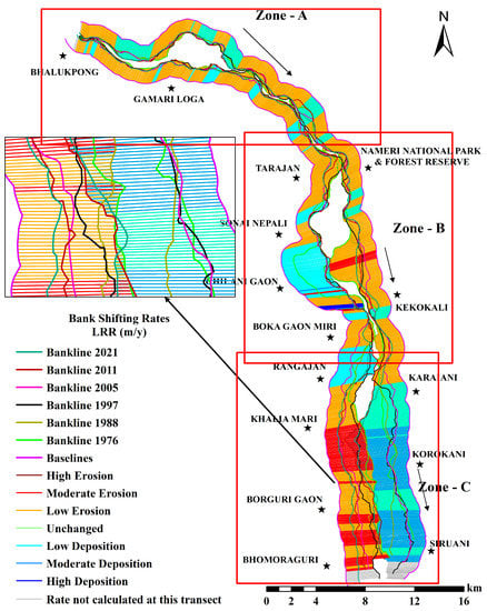 However, in the present work, we have not considered the impact of climate change on the bankline shifts in the study area. The Jia Bharali River is known for its exceptionally high flow during the rainy season, ongoing changes in channel morphology, rapid bed aggradation, and bankline modification, resulting in the lateral displacement of banklines and the annual collapse of extensive fertile land. We used the DSAS model that considers past changes in bankline shifts and simulates future changes based on that information, regardless of the cause of past shifts and whether or not they were due to short-term climate change cycles, such as El-Nino or La-Nina. The model uses shift trend information to project future changes [27,28].