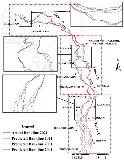 The current study evaluated geographical and temporal changes in the Jia Bharali River’s course with channel dynamicity using a geospatial model. The multi-temporal data analyses reveal that the river’s banklines were continuously altered by erosion and deposition. The river’s erosion and accretion rates were higher in early times than they have been in more recent times. Zones C and B are more adversely affected than zone A. Since the left bank of zone B experiences more erosion than the right bank, this zone is where the river is migrating to the left (eastward). Since the right bank of zone C is degrading more quickly than the left, this indicates that the river is flowing to the right (westward) in this zone. The anticipated outcome also shows that the right bank of zone C and the left bank of zone B will have greater average migration rates. Therefore, it was predicted that zone B’s left bank and zone C’s right bank would be most vulnerable to bank erosion. The current study estimated historical and future bankline movement using an artificial computing environment. Considerable ground verification and continuing observation are necessary for such automated systems. As a result, the automated DSAS-based methodology was adopted in the current analysis. This methodology can accurately measure and predict erosion and deposition. The projected and actual banklines were also used to compare the degree of accuracy. Future strategies, such as afforestation measures and limiting human interference to allow rivers to flow naturally and enhance the ecological and biological diversity of the floodplain zone [22,55], are necessary.