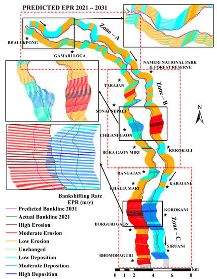 The future bankline of the Jia Bharali River was predicted for 2021 and 2031 using the DSAS model (Figure 7). The predicted results show that the average rate of bank migration in zones A, B, and C would be −0.61 and −0.55 m/y, −0.86 and −17.88 m/y, and −42.5 and 23.42 m/y in the right and left banks over 2021 to 2031, respectively. The predicted results show that during the period from 2021 to 2031, zone A would experience less erosion and deposition processes, zone B would experience moderate rates of erosion and deposition processes, and zone C would experience high grades of erosion and deposition processes, comparatively (Figure 8). During 2021 to 2031, channel expansions would predominate over the channel narrowing due to a higher negative (erosion) shift compared with a positive (deposition) shifting rate. Moreover, the right bank of zone C would be more vulnerable to bank erosion.