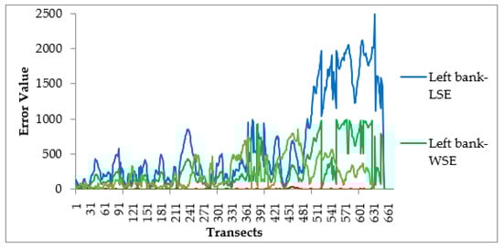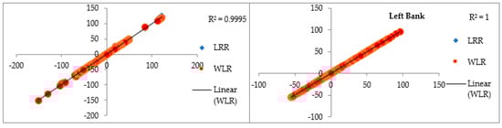 The standard error graph and R2 were estimated for accuracy assessment of the bankline change calculation using transects [39].The outcome demonstrates that, in both the right and left bankline change calculations, accuracy is high and the uncertainty is quite low in the WLR approach compared with the LRR method (Figure 10).According to these results, the WLR method is more precise than the LRR method [39,40]. The R2 value in the computations for the right bank and left bank changes is one, indicating that the outcome is satisfactory (Figure 11).