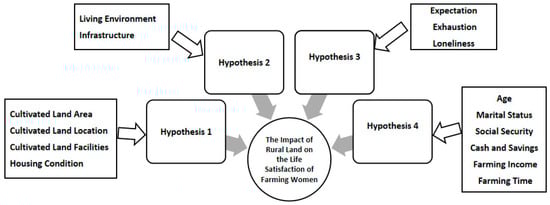 The first hypothesis relies on the physical attributes, namely, the cultivated land area, cultivated land location, land cultivation facilities, and housing conditions. In terms of cultivated land area, the larger the farmer’s farming area, the greater the farmer’s workload. Workload is often associated with stress []. The greater the stress, the lower the life satisfaction. In other words, the smaller the farmer’s farming area, the lighter the farmer’s workload, thus causing less stress and higher life satisfaction. In terms of cultivated land location, the further the farmland is from the traffic road, the quieter the working environment for farmers, so that rural women farmers can concentrate more on agricultural work, therefore causing higher life satisfaction. When it comes to the cultivated land facilities, it [] shows that the pilot of new cooperative medical care in rural areas and the inadequacy of village road construction significantly improve and reduce the life satisfaction of farmers, respectively, while irrigation difficulties lower the life satisfaction of professional farmers. Finally, in general, good housing conditions lead to higher comfort. Housing conditions, such as homeownership and house size, play important roles in determining overall happiness []. Based on this, this paper proposes:
