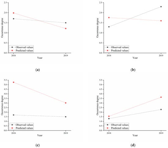 The disaster risk prediction results of the three models on the occurrence degree of corn thrips in 2018 and 2019 are shown in Figure 6. Where Figure 6a,b show the results predicted by multiple linear regression model in June and July, Figure 6c,d show the results predicted by GA-BP in June and July, and Figure 6e,f show the results predicted by GA-SVM in June and July.