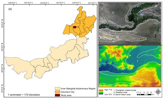 Study area. (a) is the location map, (b) is the true color remote sensing image, and (c) is the elevation map. (Ⅰ) is the floodplain wetland area, (Ⅱ) is the meadow area, and (Ⅲ) is the sand ribbon area.