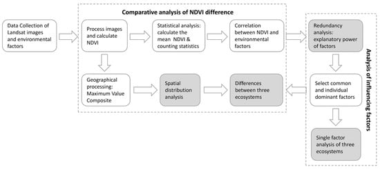 This study focused on NDVI, exploring the driving factors and distinguishing the differences between ecosystems through statistical analysis of multi-phase data. In order to reduce the disturbance caused by a difference in environmental factors observed at different times, we selected 70 remote sensing images over 30 years for this research. The main technical methods used were geographic information analysis, with the help of ENVI and ArcGIS software. Statistical data analysis was carried out using Canoco and SPSS software. The process was as follows: (1) calculate the NDVI of each ecosystem and the mean value of pixels greater than zero in each period; (2) count the NDVI data and compose the spatial distribution map; (3) analyze the correlation of environmental factors; (4) explore the differences of different ecosystems; (5) further obtain the quantitative description of the contribution of dominant factors through redundancy analysis; (6) group the main driving factors separately to explore the mechanism of impact on each ecosystem. More details are shown in Figure 2.