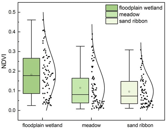 By comparing the three groups, obvious differences were found in the NDVI values of different ecosystems in one region, which were related to the type, abundance, and growth of vegetation. The NDVI of the floodplain wetland near the water source was significantly higher than that of the other two regions, and only a small area of NDVI was higher than 0.5 in the meadow and sand ribbon, which confirmed the rationality of regional division and led to further exploration of the reasons for these differences.