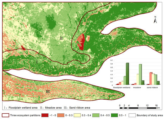 - There were significant differences in NDVI among the three ecosystems, showing wetland plain NDVI > meadow NDVI > sand ribbon NDVI. The data distribution of floodplain wetland conformed to the normal distribution, indicating that vegetation was in a state of natural growth, while meadow and sand ribbon were greatly affected by external interference, presenting a skewed distribution. The multi-year maximum value composite showed a spatial differentiation in that most NDVI values were greater than 0.5 in the floodplain wetland, 0.3–0.5 in the meadow, and less than 0.3 in the sand ribbon ecosystems. The spatial distribution of NDVI was similar to that of altitude.