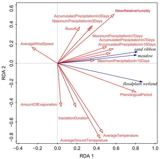 As shown in Figure 5, the blue arrow represents the response variable, which is the fitting of the NDVI values of the three ecosystems. It can be seen that the distribution of meadow and sand ribbon was similar, with some difference between them and the floodplain wetland ecosystems. The red arrows indicate the 14 explanatory variables; all factors except wind speed pointed in the direction of increasing values on the first sorting axis, because these factors are positively correlated with NDVI. The moisture factors were located in the first quadrant. The temperature factors pointed in the negative direction of the second sorting axis. The low correlation between the two datasets indicated large differences in the impact mechanisms on the ecosystem. The longest projection on the first sorting axis was the phenological period, indicating that its overall contribution to the factor variance was the highest. The shortest was evaporation. The relationship between NDVI and the driving factors clearly showed that the highest NDVI explanation rate for all three ecosystems was for the phenological period, with floodplain wetland being more influenced by temperature-related factors, and meadow and sand ribbon being more influenced by moisture-related factors, probably because floodplain wetlands were distributed on both sides of the river and had good moisture conditions. In addition to the phenological period, floodplain wetlands were most affected by average temperature but least correlated with runoff; meadows and sand ribbons were most affected by mean relative humidity and least correlated with evaporation. Based on the results of the RDA analysis, it can be concluded that moisture condition is the most important driving factor for ecosystems in semi-arid areas and that its influence on plant growth is higher than that of other environmental factors such as temperature and insolation duration.