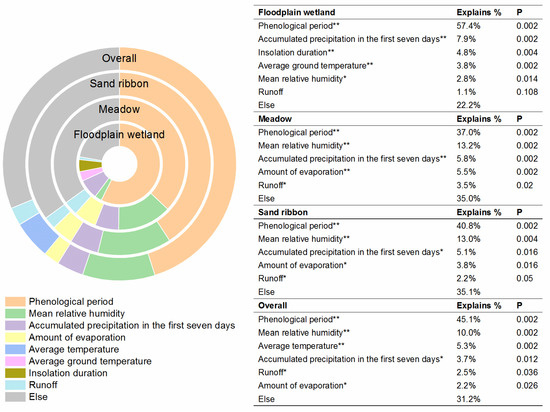 It can be seen from the biordered graph obtained by RDA that there is also a strong correlation between each driving factor. In order to better identify the degree of influence of each factor on NDVI, forward selection is used to eliminate the collinearity between factors, and the top six factors with synergistic explanatory power for the three ecosystems from high to low at the significant level are screened out. As shown in Figure 6, the total explanation reached 68.8% when the phenological period, mean relative humidity, average temperature, accumulated precipitation in the first seven days, runoff, and amount of evaporation were all taken into account. With the exception of phenology, the explanation of other factors was slightly lower. The factor explanation of floodplain wetland was the highest, reaching 77.8%, and phenological period occupied an overwhelming proportion, which was obviously different from other ecosystems. Insolation duration and average ground temperature also had significant effects, and the 1% contribution of runoff is not significant. The NDVI of meadow and sand ribbon ecosystems had a relatively similar composition of environmental explanations, and the difference was reflected in the higher explanatory power of phenological period for sand ribbon and the higher explanatory power of the amount of evaporation and runoff for meadow.