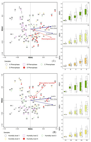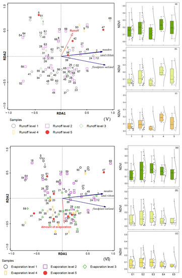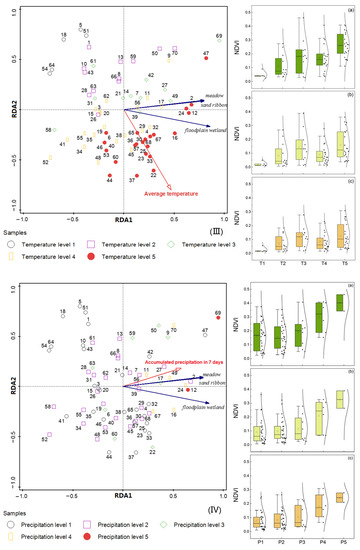 Each of the six dominant driving factors was divided into five equally spaced groups, and the characteristics and effects on each ecosystem were observed. The main figures are the RDA triorder diagrams displayed in groups, and the secondary figures are the NDVI statistical diagrams within each group of the three systems. The points in the triorder diagram are 70 sample points with full factor attributes, and the coordinates are the scores of the samples on the two axes. The distance between the points indicates the dissimilarity between each sample. The projection of the sample points along the arrow of the environmental variable is approximately the size of the data value of the factor, where the value close to the origin is the average value, and the value increases along the direction of the arrow. Therefore, the sample point group after grouping the data has the distribution characteristics of an increasing gradient in a direction perpendicular to the arrow. This distribution trend is more obvious in the triorder graph.