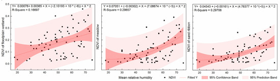 The Hulunbuir Grassland in the semi-arid region was more affected by moisture conditions such as humidity and precipitation than other climatic factors such as temperature [31]. Sand ribbon ecosystem with low soil moisture content had a stronger immediate response to precipitation compared to other areas. In contrast, the floodplain wetland, with its sufficient groundwater supply, had a low demand for humidity and a higher response to temperature than the meadow and sand ribbon ecosystems. This result was also consistent with the findings of Hou Guanglei [55], Yang Da [56], and other scholars. On the other hand, compared with precipitation, humidity had a more direct effect on the available water for vegetation [57] and better binomial fitting with each system as shown in Figure 8. The overall performance showed that NDVI increased with an increase in humidity, but with apparent differences among the three systems; the meadow ecosystem stood out, showing a more drastic increase with higher humidity.