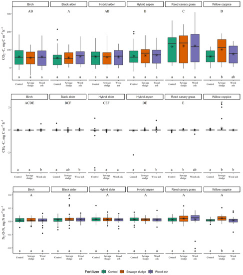 Soil GHG fluxes in plots dominated by deciduous trees, willow coppice or RCG in agroforestry systems in hemiboreal Latvia during the measurement period (June 2020–October 2021), grouped by type of soil fertilisation practice. In the box plots, the median is shown by the bold line, the mean is shown by the black asterisk, the box corresponds to the lower and upper quartiles, the whiskers show the minimal and maximal values (within 150% of the interquartile range from the median) and the black dots represent outliers of the datasets. Different uppercase letters show statistically significant differences (p < 0.05) between types of dominant vegetation (all soil fertilisation management practices were pooled); different lowercase letters show statistically significant differences (p < 0.05) between soil fertilisation management practices within the same dominant vegetation.