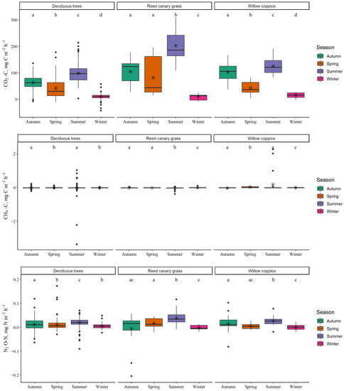 The impact of seasonality on soil GHG fluxes in plots dominated by deciduous trees, willow coppice or RCG in agroforestry systems in hemiboreal Latvia during the measurement period (June 2020–October 2021). In the box plots, the median is shown by the bold line, the mean is shown by the black asterisk, the box corresponds to the lower and upper quartiles, the whiskers show the minimal and maximal values (within 150% of the interquartile range from the median) and the black dots represent outliers of the datasets. Different lowercase letters show statistically significant differences (p < 0.05) between seasons within the group of dominant vegetation.