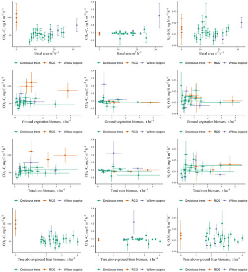 Relationships between mean soil GHG fluxes and parameters of vegetation biomass in plots dominated by deciduous trees, willow coppice, or RCG in agroforestry systems in hemiboreal Latvia.