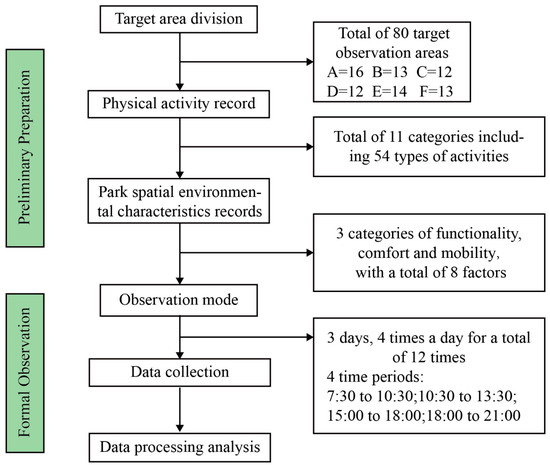 On the basis of the observation scale proposed by McKenzie, we refine the classification of physical activity and indicators of spatial characteristics. The following section mainly describes the SOPARC method in detail from the aspects of observation area division, physical activity recording, park space feature recording, and data collection and analysis, as shown in Figure 2.
