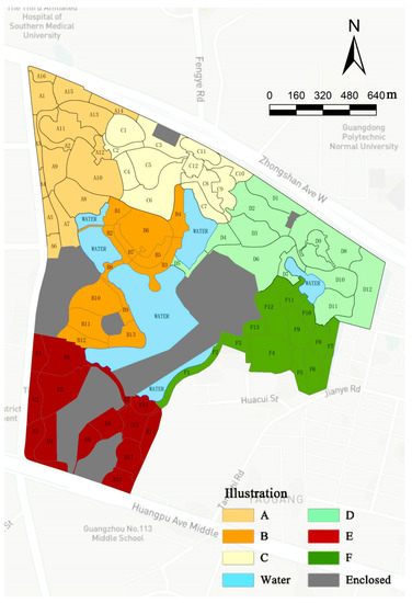 This study excludes areas that were closed for construction and thus inaccessible. The entire park is divided into six zones (A–F) based on spatial function, form, and appearance. A total of 80 target observation areas were delineated based on the park’s road network, as shown in Figure 3 (A = 16, B = 13, C = 12, D = 12, E = 14, F = 13). The gray areas represent the closed-off sections due to subway construction. Given that several observation areas had topographical features or buildings, observers selected one to three observation points based on the specific conditions to ensure an accurate count of all active individuals within the study area. This approach ensured that the observer’s line of sight covered the entire observation area.