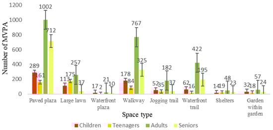 Figure 4 shows the number of MVPA participants in different types of spaces across age groups. The data show that adults and seniors engage in MVPA in similar types of spaces, mainly on paved plaza, walkways, and waterfront trail. By contrast, children and teenagers prefer to engage in MVPA on large lawns rather than waterfront trail, in addition to the paved plaza and walkways. Notably, the paved plaza are the gathering places for MVPA among children, adults, and seniors, while large lawns are the favorite spaces for MVPA among teenagers. Details can be found in Appendix C.