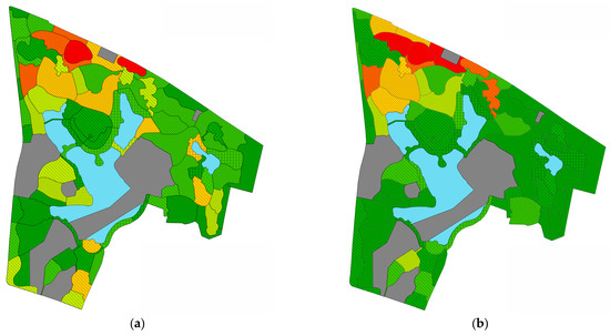 Figure 5 provides a visual representation of the spatial distribution of MVPA among different age groups. MVPA among children and teenagers is concentrated in the northwest corner of the park, with the latter gathering in two large lawns and adjacent paved plazas, while children showed high MVPA in the plaza at the north entrance. MVPA among adults is mainly distributed in the northeast corner of the park with a scattered distribution, and also in the spaces where MVPA is more prevalent among children and teenagers. The distribution of MVPA among the seniors and other age groups, especially teenagers, has little overlap, and is mainly concentrated in spaces near the park’s water bodies. Overall, the park has a unique distribution of MVPA among different age groups.