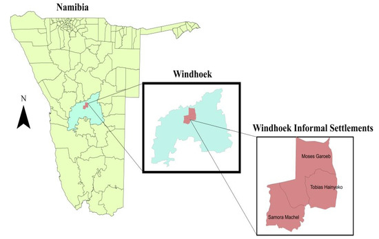 The study was centered on three informal settlements in Katutura, Windhoek, Namibia. The informal settlements are Samora Machel Constituency, Tobias Hainyeko Constituency, and Moses Garoeb Constituency. The three informal settlements are located about 5 km from the city centre and are next to each other. These three informal settlements are densely populated (49.18, 45.91, and 41.99 inhabitants per square km, respectively) [35]. They are largely characterized by lack of basic infrastructure, high unemployment rates, poor water and environmental sanitation, poor housing, insecurity, violence, and poor health indicator.