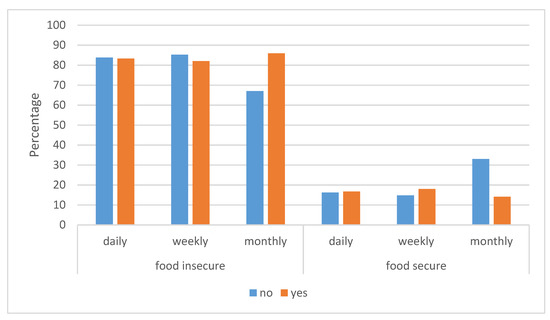 Figure 3 shows the relationship between food insecurity and food purchase frequency. Most food insecure households were likely to do monthly food purchases, while there was no difference between daily and weekly purchases for those who were food insecure. The pattern is similar for the food secure households, although the percentages were low.