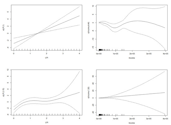 Nonlinear effects of LPI and income, with the estimated line provided as the solid central line accompanied by 95% confidence band, shown as dotted lines.