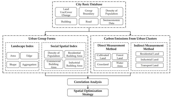 The current research on the spatio-temporal differences in carbon emissions mainly focuses on the national and provincial levels or some mature urban agglomerations. The existing studies mostly use technology black boxes to calculate carbon emissions and sinks. Moreover, the correlation degree between carbon emissions and sinks and relevant factors at the city level is not discussed enough, and carbon emissions and sinks are mostly calculated at the national, provincial and urban agglomeration levels. The construction of analysis framework on the scale of urban clusters is still lacking, which is not conducive to guiding the specific construction points of low-carbon cities. Therefore, in this study, 50 urban clusters in Zhuhai were taken as the research object. The landscape spatial form index and social spatial form index of each urban cluster were calculated, and the urban spatial form index system was established through screening. Carbon emissions were estimated by direct and indirect measurements. Then, the effects of different urban spatial form indexes on carbon emissions were analyzed. The main objective of this study is to explore how carbon emissions are affected by urban spatial form, propose specific spatial optimization strategies and clarify the practicability and practical significance of the study. The framework for analyzing is shown in Figure 1.