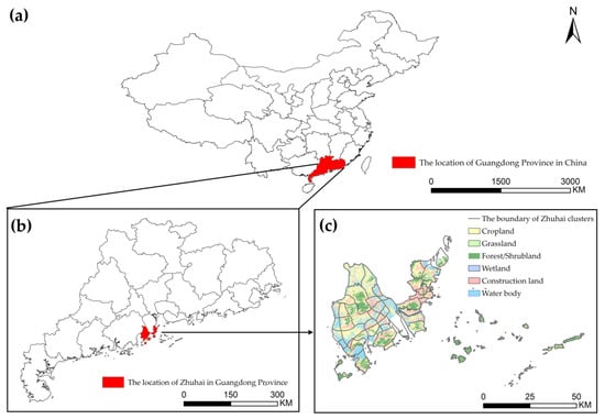 (a) The location of Guangdong Province, (b) The location of Zhuhai in Guangdong Province. (c) Distribution of planning and governance units in Zhuhai.
