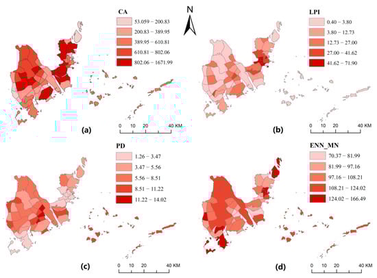 Spatial distribution of landscape spatial form index in Zhuhai: (a) CA, (b) LPI, (c) PD, and (d) ENN_MN.
