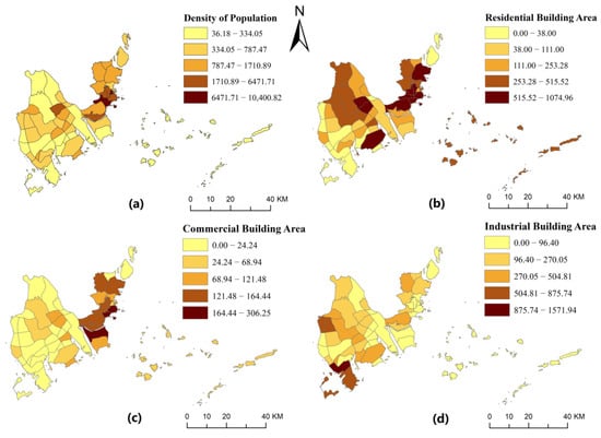 The spatial distribution of social spatial form index in Zhuhai: (a) density of population, (b) residential building area, (c) commercial building area, (d) industrial building area.