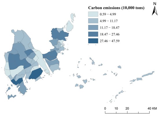 The carbon emissions of each cluster in Zhuhai are obtained by adding the values obtained by the direct and indirect measurement methods, as shown in Figure 5. Zhuhai’s carbon emissions totaled 6.16 million tons. According to China’s county-level carbon dioxide emission inventory [], Zhuhai’s carbon dioxide emission in 2017 was about 16.13 million tons. Since one ton of carbon completely burned in oxygen produces about 3.67 tons of carbon dioxide, the resulting carbon emission from the inventory is about 4.4 million tons. Considering that the carbon emission in 2020 is calculated in this paper, the result is not much different from that calculated in this paper, which is considered to be basically reasonable.