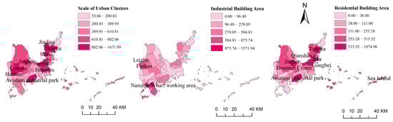 As can be seen from Figure 4a, the densely populated areas of Zhuhai are mainly distributed in Xiangzhou (the central area of Zhuhai), especially Qianshan Cluster and Shishan Cluster. Jingan Cluster, as the central urban area of Doumen District (western suburb) and one of the sub-centers of Zhuhai, has a high population density too. In contrast, the population density of other clusters is lower, and there is still a large room for population growth. As can be seen from Figure 4b, there are more high-value areas of residential building area and relatively dispersed areas. For example, Xiangzhou District, aviation industrial Park in the western suburbs and Doumen Center and other clusters of residential buildings are relatively high, which is basically consistent with the distribution of densely populated areas. In the southwest of Zhuhai, the residential area of the cluster is small. This area is an industrial intensive area, which is dominated by industrial land. As can be seen from Figure 4c, there is a large gap between the east and west of Zhuhai in terms of commercial building area. Xiangzhou district in the east is generally higher, while Doumen District and Jinwan District in the west is generally lower. It reflects the commercial development gap between the East and west of Zhuhai. As can be seen from Figure 4d, different from the commercial building area, the industrial building area of Zhuhai is generally higher in the west and lower in the east. The industrial layout of Zhuhai is mainly in the western district, especially the booming development of Gaolan Industrial zone and Fushan Industrial Zone, which result in the large industrial building area of these two clusters. The industry in the east has basically completed the relocation, and the industrial structure is dominated by the tertiary industry.