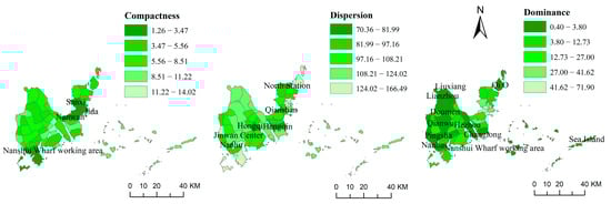 As can be seen from Figure 3a, the overall distribution of large urban clusters in Zhuhai is relatively uniform. Since this index has a large correlation with the total area of urban clusters, the scale of urban clusters in Xiangzhou District (eastern central urban area) is relatively small. As can be seen from Figure 3b, the urban clusters with high dominance in Zhuhai are mainly located in Xiangzhou District. Due to the long development time within these clusters, the fragmented built-up areas within them have been basically contiguous, and the dominance of large built-up patches is strong. In contrast, the dominance of the western district of Zhuhai is relatively low. As can be seen from Figure 3c, the areas with high patch density (PD) are mainly distributed in the western suburbs of Zhuhai (Doumen District and Jinwan District), especially the central district of Jinwan, Hezhou high-speed railway Station and Fushan Industrial Zone. The main reason is industrial structure. Due to the large amount of farmland and other ecological land, the patches of construction land are cut into small pieces, resulting in high patch density. On the contrary, the patch density in eastern central city was lower. As can be seen from Figure 3d, ENN_MN was generally high and evenly distributed, showing a high distribution in the west and low distribution in the east. The high dispersion of most clusters in the western suburbs of Zhuhai reflects that the construction of a large number of new towns and the expansion of construction land in the western suburbs in recent years lead to the high dispersion of built-up areas. The high dispersion of Xiangzhou District (central urban area) is mainly in the east coastal zone. These areas are mainly blocked by terrain, and the patch dispersion is high. The central area of Jinwan in the western suburbs of Zhuhai and the high-tech zone in the north of Xiangzhou District are depressions with group dispersion. The construction land in these places is mainly distributed in the plain, and the built-up areas are basically contiguous with low dispersion.
